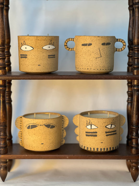 Gigil Candle Collection, hand thrown stoneware vessels filled with coconut soy wax and natural essential oils. Each piece is unique, functional, and reusable. Once the candle is finished, enjoy it as a mug. Fired at 1220°C. Food, microwave, and dishwasher safe.