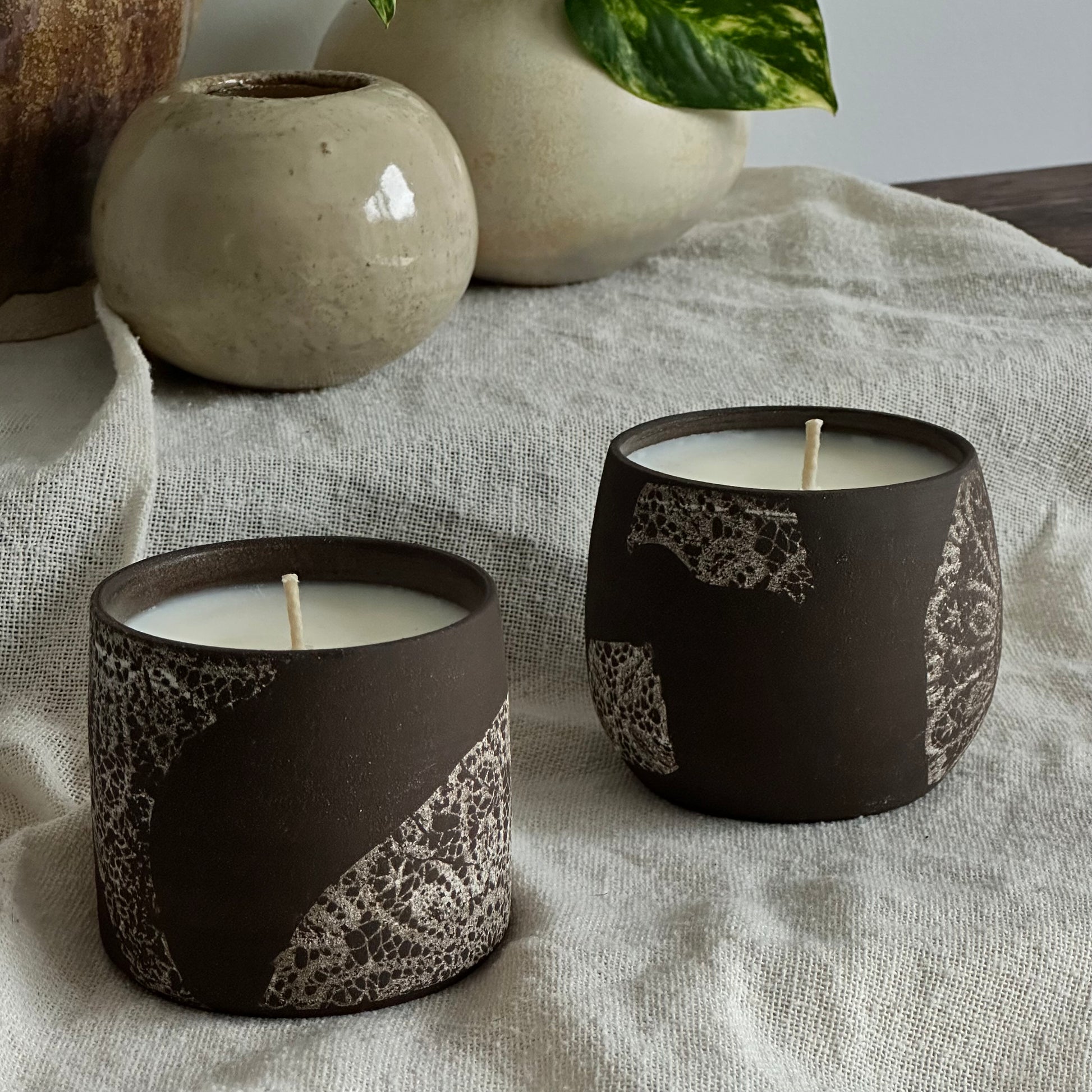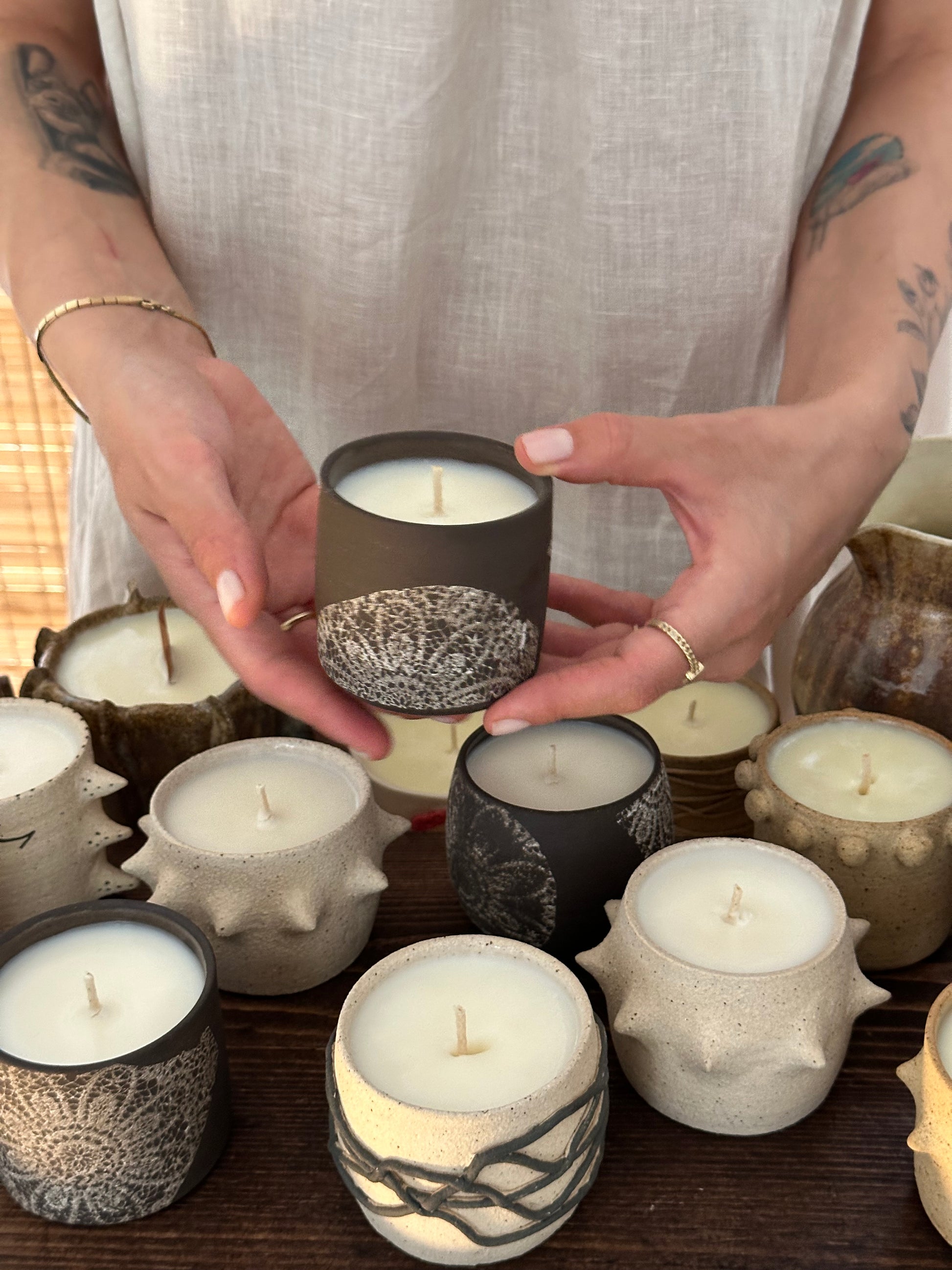Handcrafted stoneware candles made with natural coconut soy wax and pure essential oils. Each vessel is wheel thrown, fired at 1220°C, and fully reusable as a mug once the candle is finished. Food, microwave, and dishwasher safe, a sustainable piece of art that keeps giving.